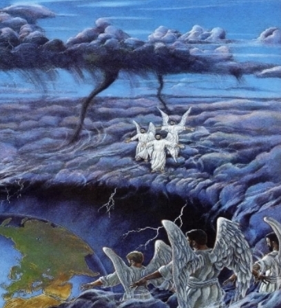 Obj.7:1 Potem zobaczyłem czterech aniołów. Stali oni na czterech krańcach ziemi i powstrzymywali cztery jej wiatry, tak by nie wiał wiatr ani na ziemię, ani na morze, ani na żadne drzewo.