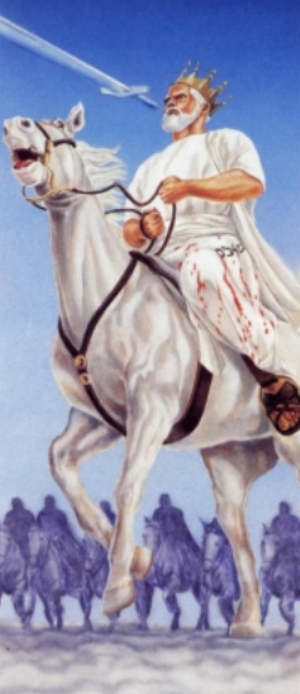 Teraz Jan widzi z nieba białego konia. Jeździec prowadzi wojnę w sprawiedliwości. Jest ubrany w szatę skropioną krwią, a jego imię brzmi: Słowo Boże. Armie wojenne podążają za nim w białych szatach.